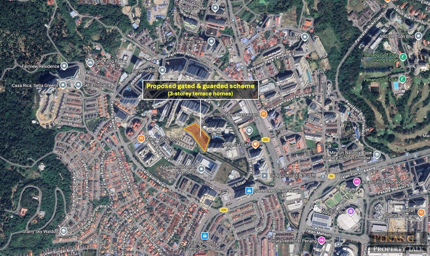 A proposed strata residential development on a 2.75-acre land in Sungai Ara, located off Lintang Sungai Ara 14. The site is situated adjacent to Imperial Residences and One Imperial, within an established residential area. It is approximately 1km from SPICE Arena and about a 15-minute drive to the Bayan Lepas Free Industrial Zone.
