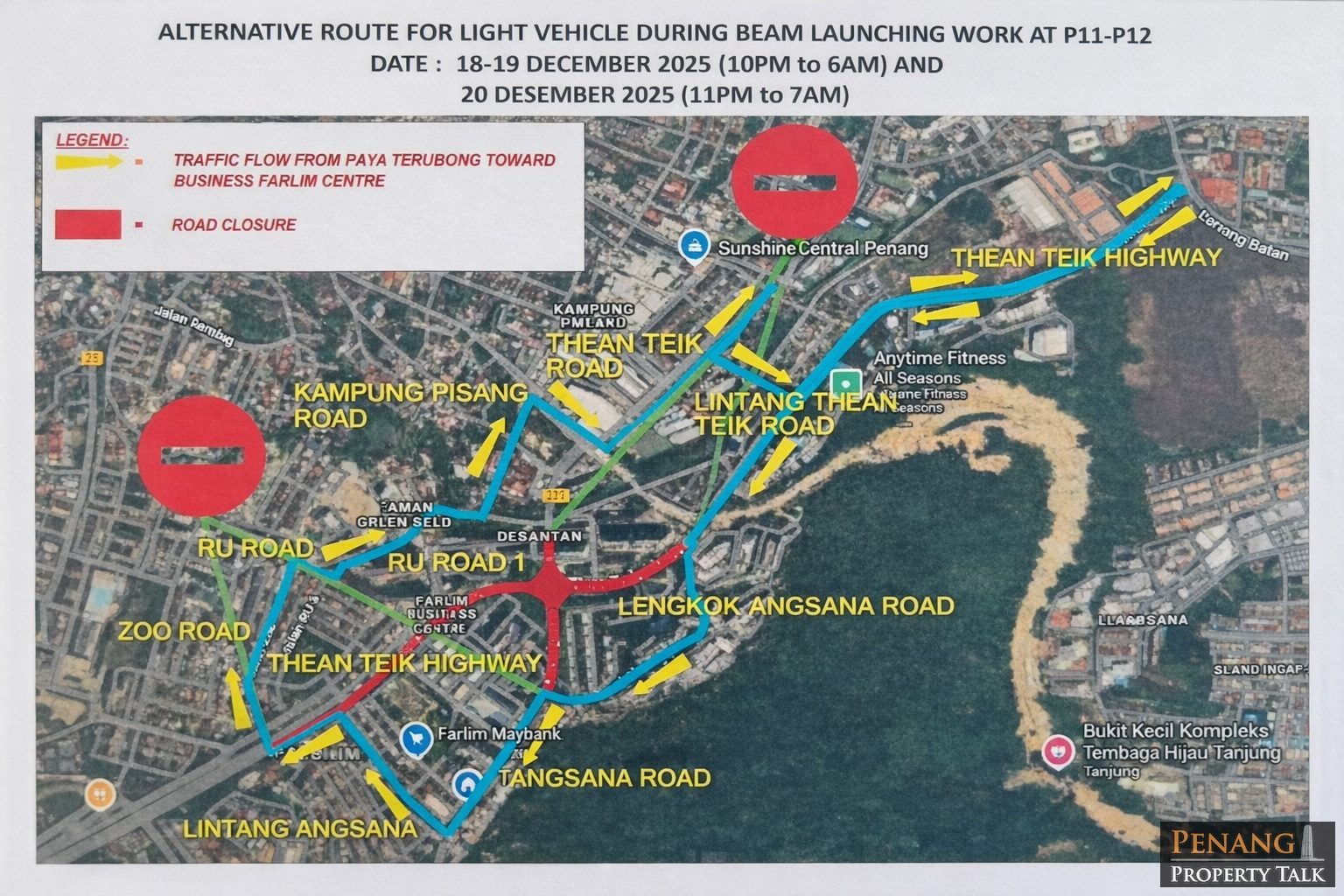 Heavy vehicles will not be allowed through the Farlim Business Centre during the closure period and are advised to use Jalan Thean Teik, Jalan Kampung Pisang or Jalan Paya Terubong instead. Several alternative routes have also been arranged for light vehicles around Farlim to minimise disruption.